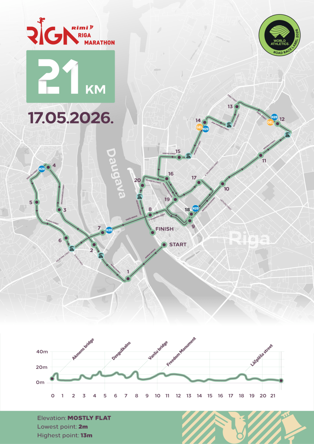 Pieveiciet pusmaratonu 2 cilvēku komandu stafetē—divi posmi: 10,2 km un 10,9 km.